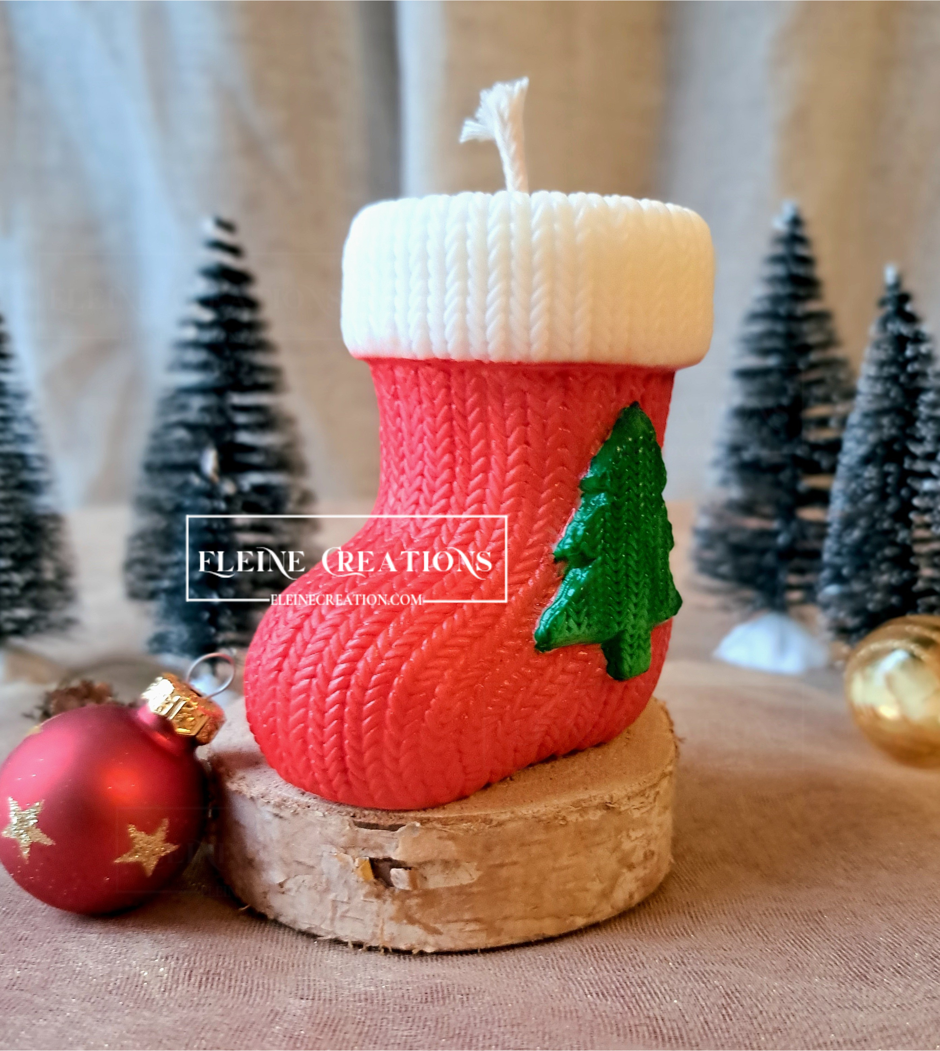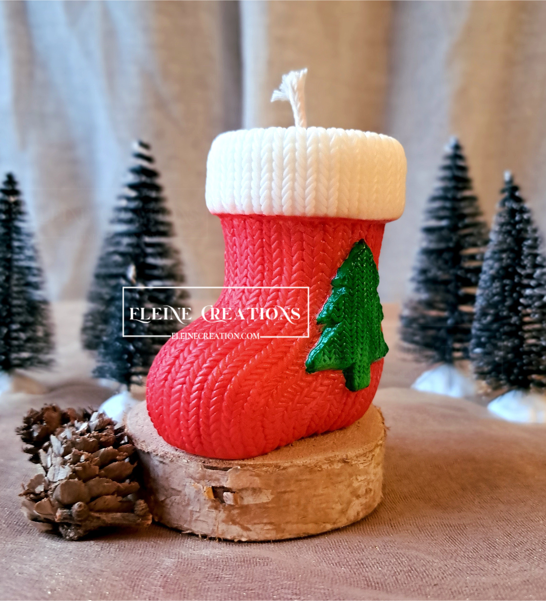🕯️ Candela a forma di calza natalizia in cera, con effetto “maglia” e una delicata decorazione di pino verde sulla superficie 🌲